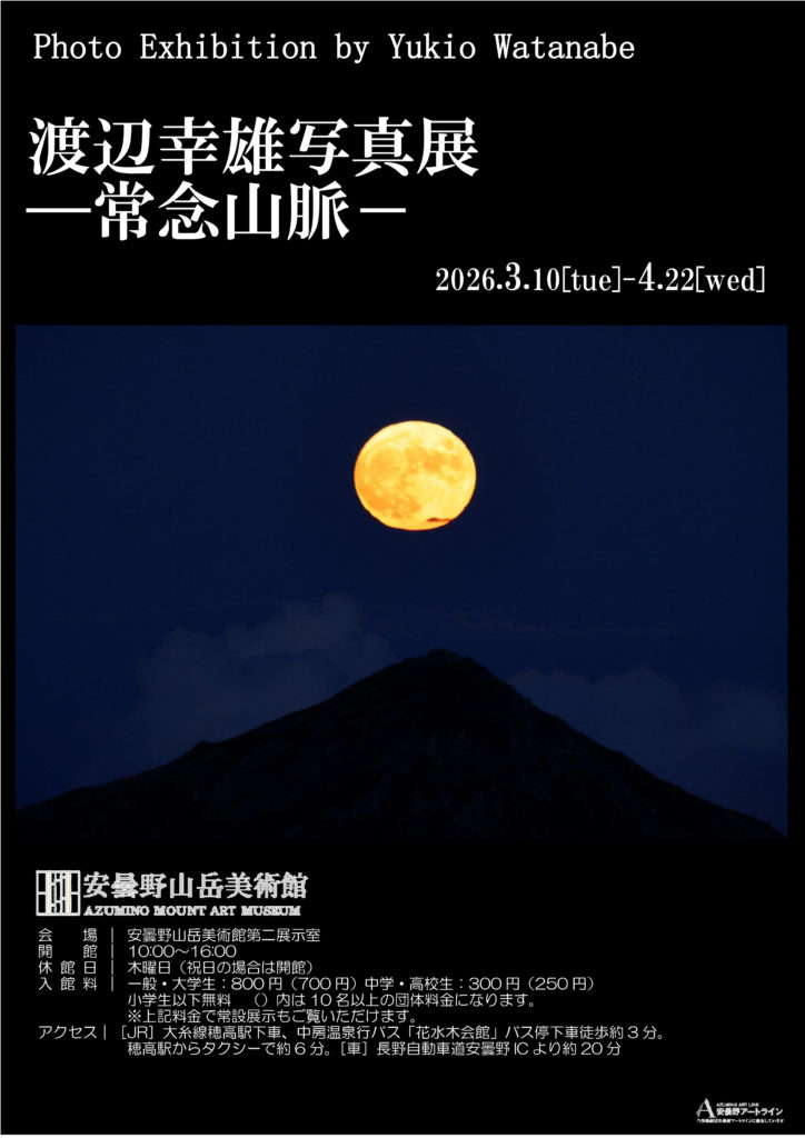 3月10日(火)~4月22日(水) 渡辺幸雄山岳写真展 4月25日(土)~6月24日(水) 橋尾歌子避難小屋原画展Part2 6月27日(土)~9月23日(水) 畦地梅太郎展 9月26日(土)~11月25日(水) 山下康一日本画展 11月28日(土)~12月9日(水) exhibition THE HOME 地元作家展 来年のご来館をお待ちしております。
